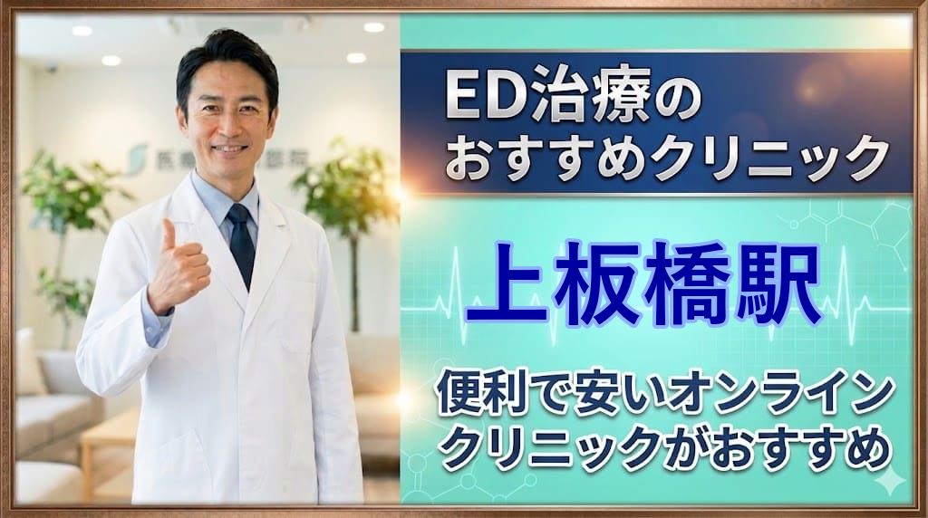 上板橋駅(板橋区)周辺でおすすめのED治療クリニックを詳しく紹介しています。便利なオンライン診療の可否、ED治療薬の種類の多さ、ED治療薬の価格などを比較し、ED治療クリニックで後悔しない選び方を紹介しています。