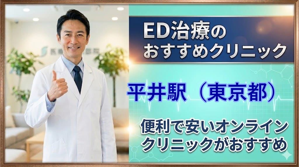 平井駅(東京都)周辺でおすすめのED治療クリニック15選!後悔しないED治療クリニックはどこ?【安い泌尿器科】安心して通えるクリニック15選を詳しく紹介。オンライン診療の可否、ED治療薬プラン、価格の安さなどを比較し、ED治療クリニック初心者向けの後悔しない選び方を解説します。平井駅(東京都)エリアから15院を厳選しています。本記事をご覧頂くだけで、平井駅(東京都)近隣のおすすめED治療クリニックが全て分かります。 -