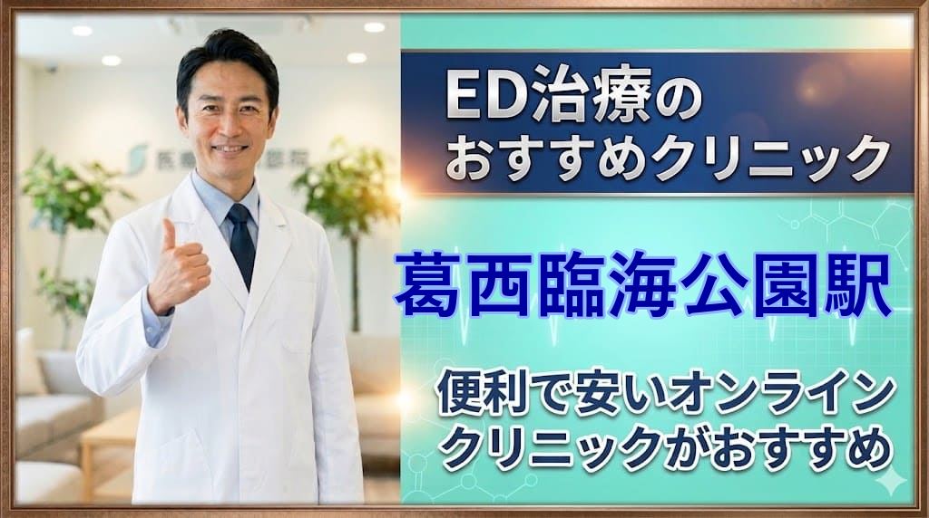 葛西臨海公園駅(江戸川区)周辺でおすすめのED治療クリニック15選!後悔しないED治療クリニックはどこ?【安い泌尿器科】安心して通えるクリニック15選を詳しく紹介。オンライン診療の可否、ED治療薬プラン、価格の安さなどを比較し、ED治療クリニック初心者向けの後悔しない選び方を解説します。葛西臨海公園駅エリアから15院を厳選しています。本記事をご覧頂くだけで、葛西臨海公園駅近隣のおすすめED治療クリニックが全て分かります。
