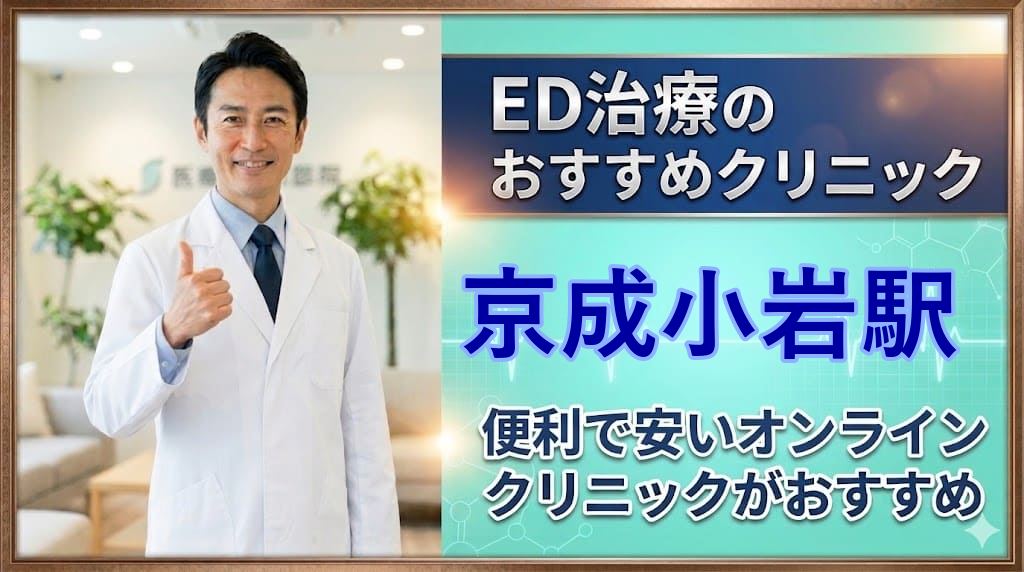 京成小岩駅(江戸川区)周辺でおすすめのED治療クリニック15選!後悔しないED治療クリニックはどこ?【安い泌尿器科】安心して通えるクリニック15選を詳しく紹介。オンライン診療の可否、ED治療薬プラン、価格の安さなどを比較し、ED治療クリニック初心者向けの後悔しない選び方を解説します。京成小岩駅エリアから15院を厳選しています。本記事をご覧頂くだけで、京成小岩駅近隣のおすすめED治療クリニックが全て分かります。 -