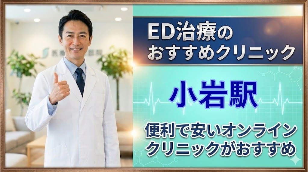 小岩駅(江戸川区)周辺でおすすめのED治療クリニック15選!後悔しないED治療クリニックはどこ?【安い泌尿器科】安心して通えるクリニック15選を詳しく紹介。オンライン診療の可否、ED治療薬プラン、価格の安さなどを比較し、ED治療クリニック初心者向けの後悔しない選び方を解説します。小岩駅エリアから15院を厳選しています。本記事をご覧頂くだけで、小岩駅近隣のおすすめED治療クリニックが全て分かります。 -