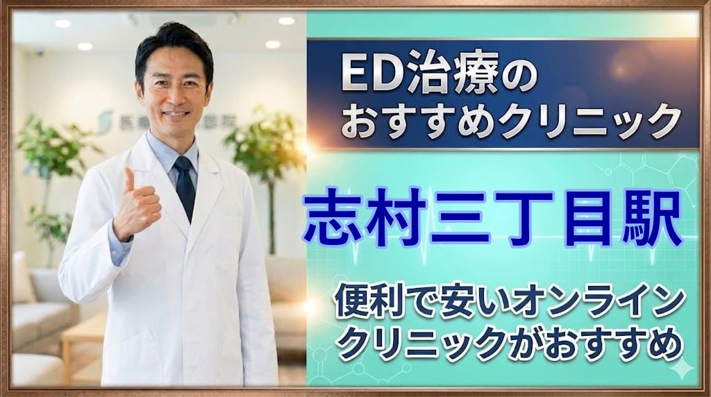志村三丁目駅(板橋区)周辺でおすすめのED治療クリニックを詳しく紹介しています。便利なオンライン診療の可否、ED治療薬の種類の多さ、ED治療薬の価格などを比較し、ED治療クリニックで後悔しない選び方を紹介しています。
