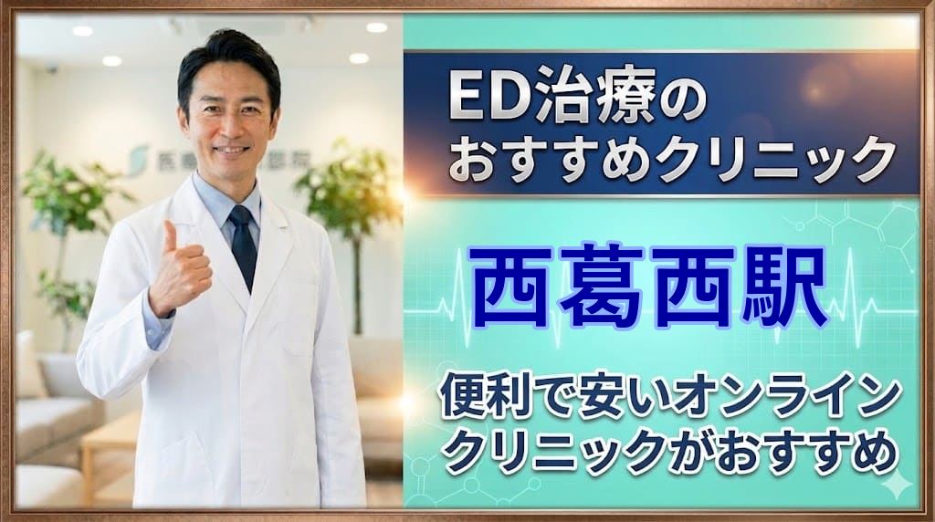 西葛西駅(江戸川区)周辺でおすすめのED治療クリニック15選!後悔しないED治療クリニックはどこ?【安い泌尿器科】安心して通えるクリニック15選を詳しく紹介。オンライン診療の可否、ED治療薬プラン、価格の安さなどを比較し、ED治療クリニック初心者向けの後悔しない選び方を解説します。西葛西駅エリアから15院を厳選しています。本記事をご覧頂くだけで、西葛西駅近隣のおすすめED治療クリニックが全て分かります。